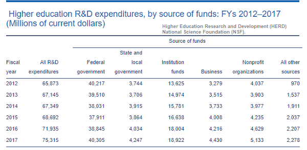 Isso dá nada menos que 84% do financiamento de pesquisa e desenvolvimento total no ano fiscal de 2017 – que foi até setembro passado. E já foi mais, porque o pai do amigo do pai “dele” vem cortando estes fundos.