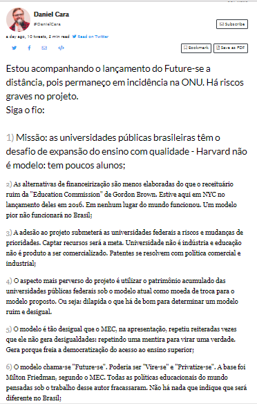 Aí busquei, e reporto, o que está postado no Twitter do cientista político, que é filiado ao PSol. O conteúdo é idêntico ao do áudio: