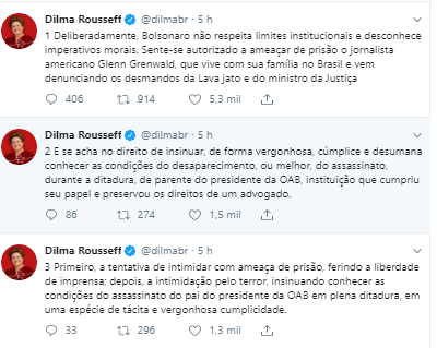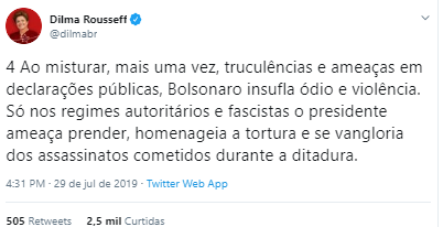 Dilma também se manifestou no Twitter. Para ela, o atual presidente “não respeita limites institucionais e desconhece imperativos morais.”