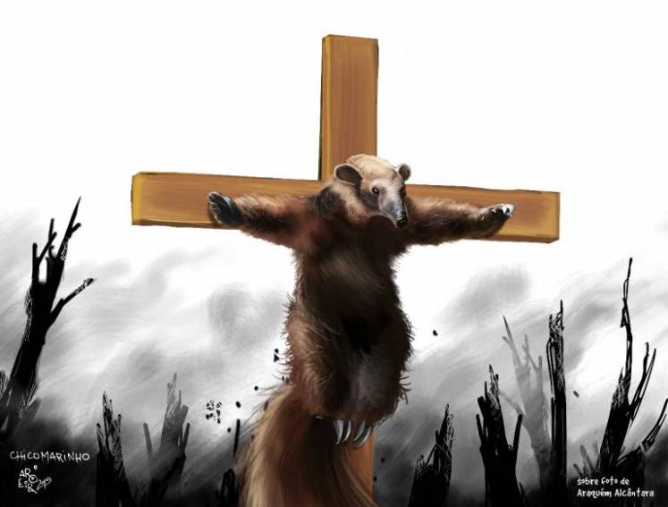 Mas é o tamanduá a vítima-símbolo, imortalizada na genialidade de um trio: Araquém Alcântara que clicou o bicho em fuga e sofrimento na Amazônia; Chico Marinho, que teve a ideia da charge e Renato Aroeira que desenhou – com todos os créditos, como se deve.
