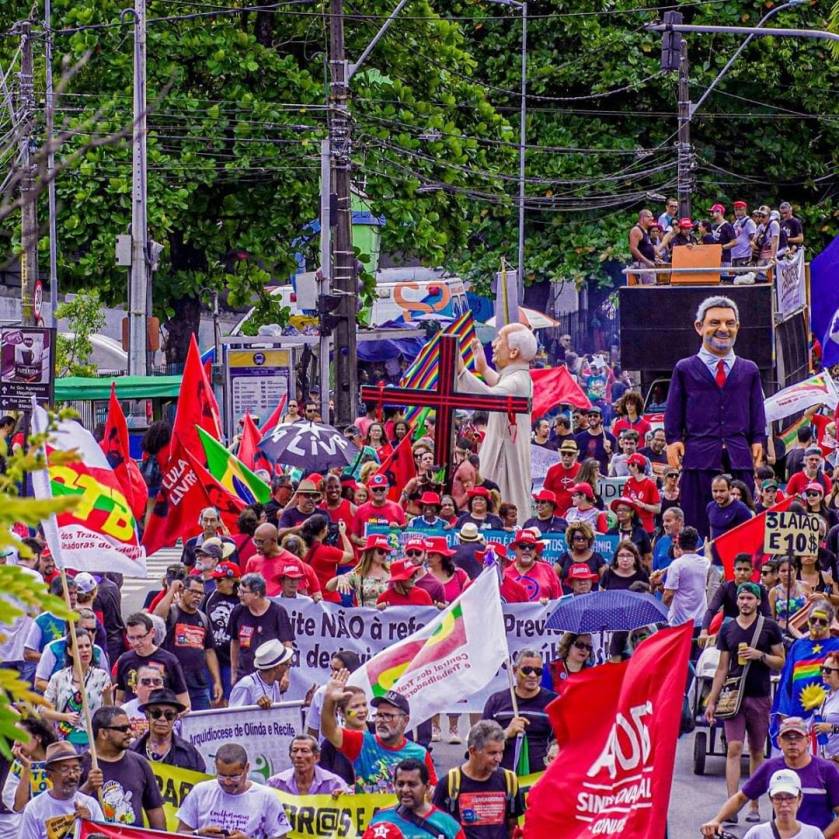 Por isso, a defesa da educação, da Previdência Social, da Amazônia, dos direitos da populações atingidas pelas barragens, como em Brumadinho nas Minas Gerais, dos direitos dos trabalhadores, da liberdade para o povo e para o ex-presidente Lula, preso sem crime e sem provas em Curitiba.