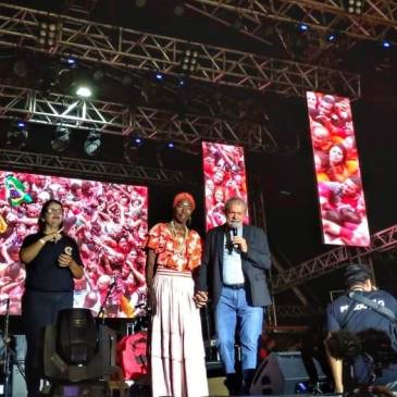 O ex-presidente agradeceu o apoio e a solidariedade que recebeu ao longo dos 580 dias de cárcere, simbolizados na pessoa de Lia de Itamaracá, que o conduziu ao palco.