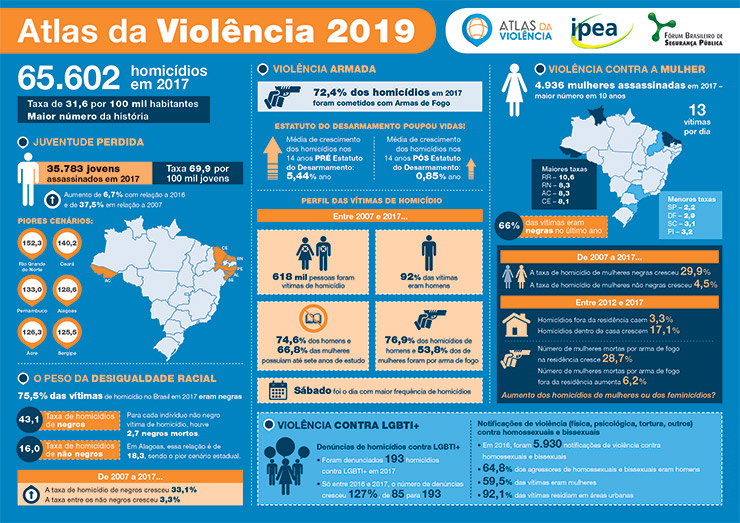 Veja aí o resumo do Atlas da Violência 2019 publicado pelo Ipea, com dados relativos a 2017, mas é um histórico que se repete ano após ano: