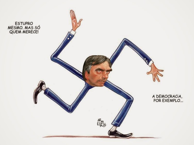 (…) e aqui digo Euzinha, segue à larga o Bolsonaro, vomitando seu preconceito, destilando seu ódio, provocando e ofendendo a quem ousa divergir de seus métodos e linguajar inqualificáveis. Indiferente ao asco que provocam seus despropósitos.