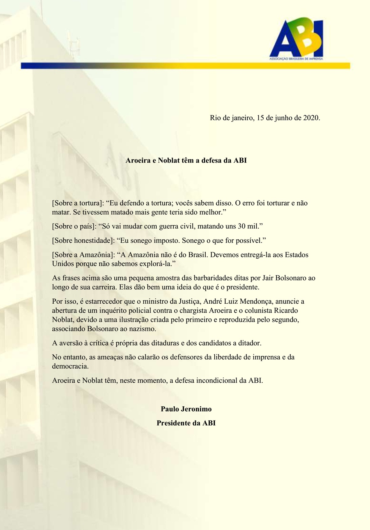 Em defesa dos profissionais ameaçados de processo, a ABI – Associação Brasileira de Imprensa divulga nota em que lembra algumas das barbaridades que não deixam dúvida quanto a natureza política do ser que desgoverna este país: