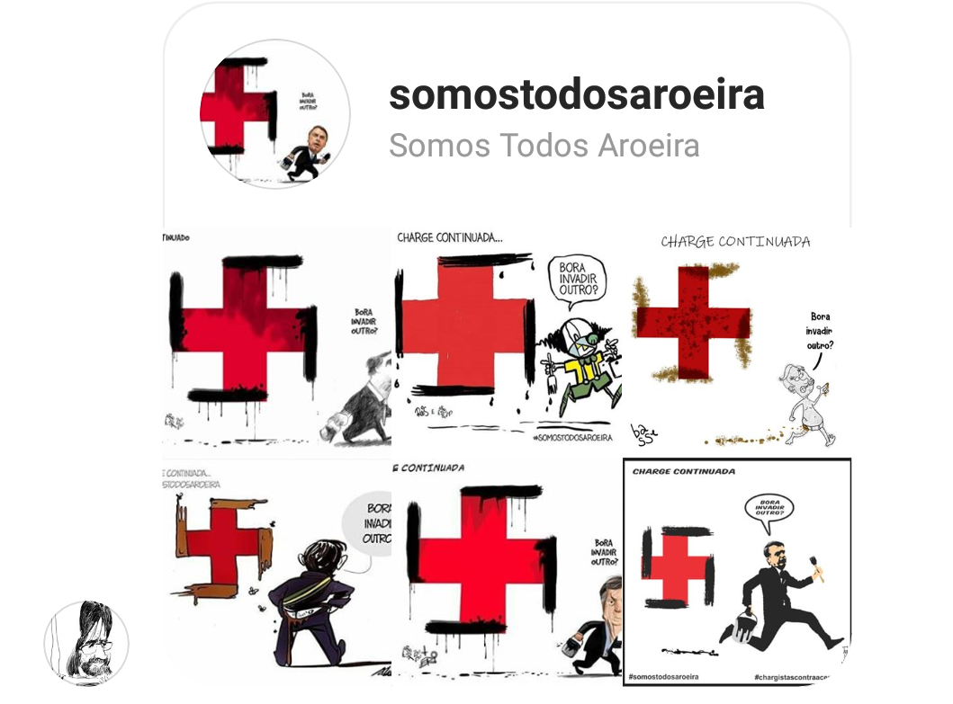 Em defesa da liberdade de expressão, dezenas deles recriaram a charge de Aroeira que transforma na suástica nazista a cruz-símbolo da saúde, vandalizada pelo capiroto.