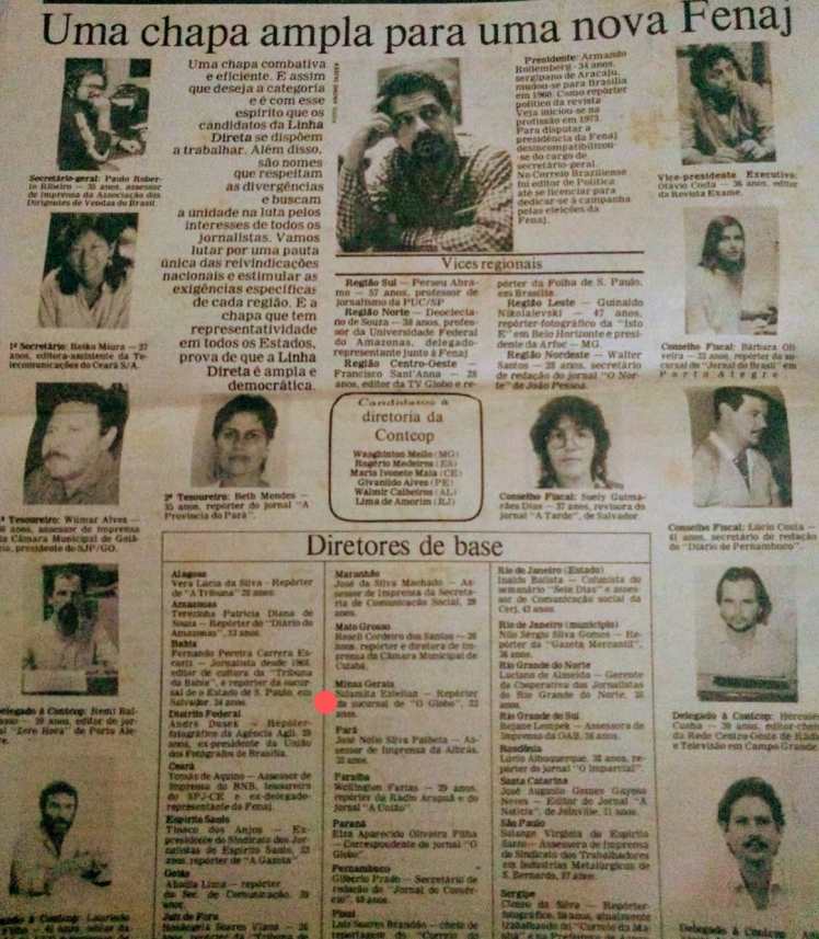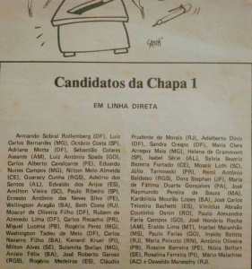 Aqui o fim é o princípio: a imagem acima é da chapa Em Linha Direta, encabeçada pelo jornalista braziliense Armando Rollemberg. E tinha uma companheirada de primeira linha, por exemplo, Reiko Miúra, minha amiga-irmã japa paulistana, e o professor e escritor Laurindo Leal Filho, o Lalo.