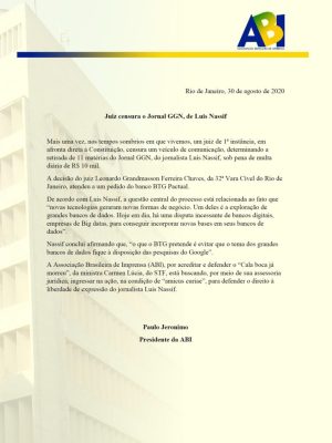 A ABI – Associação Brasileira de Imprensa divulgou nota de protesto, adotando o “cala a boca já morreu” da ministra do STF Carmén Lúcia. Anunciou que vai entrar como “amicus curae” na ação a ser proposta por Luiz Nassif contra a imposição da censura.