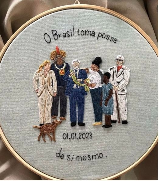 Resgato a cena do topo da rampa, pois que inesquecível – e que não me exijam a ordem exata. A faixa, novinha em folha, livre de vodu, em tafetá verde e amarelo, passa de mão em mão: do cacique Raoni para a cozinheira branca da Vigília Lula Livre; dela para o companheiro plantonista nos 580 dias, e deste para o rapaz deficiente, trajado a caráter para lembrar a existência de seus iguais; o universitário recebe e passa para o jovem trabalhador, que repassa ao menino negro, campeão na vida e nas piscinas…